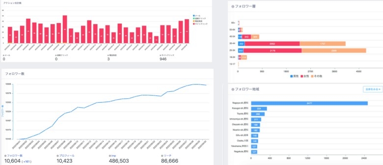 機能…・フォロワー数推移・フォロワーの年齢層と地域 ・プロフィールアクセス ・imp ・リーチ閲覧者数・アクション合計数:メール数、道順クリック、電話の発信数、サイトクリック数