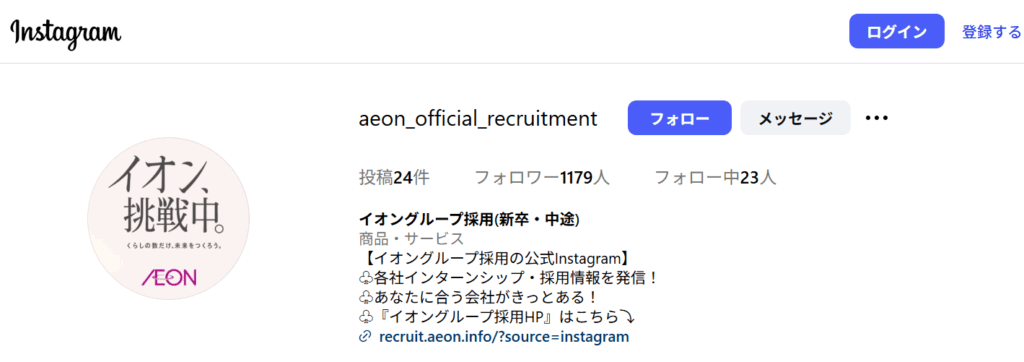 大手流通グループのイオンは、新卒・中途の両方を対象にした採用アカウントを運用しており、説明会やインターンシップの告知を積極的に発信しています。ストーリーズではグループ実績を公開し、さらにDX推進の取り組みもわかりやすく紹介し求職者を惹きつけています。