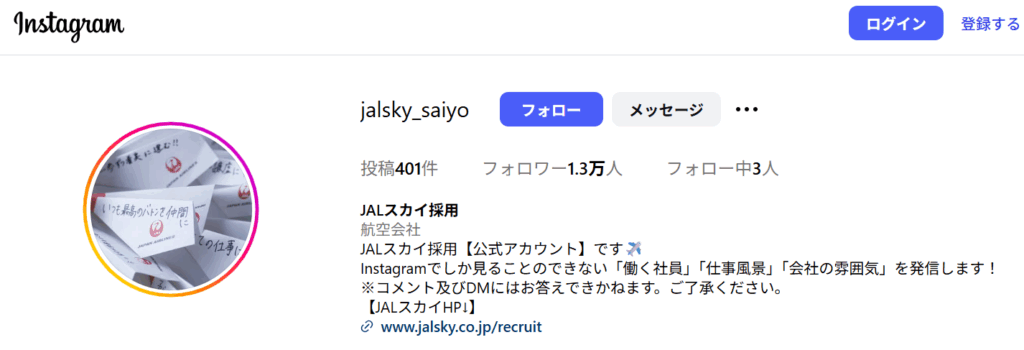 JALスカイの採用アカウントは、フォロワー数1万人を超える人気ぶりで、航空業界における成功事例として知られています。発券カウンター業務や空港ラウンジの紹介など、求人サイトだけでは伝えきれない業務内容を詳しく投稿している点が際立つポイントです。