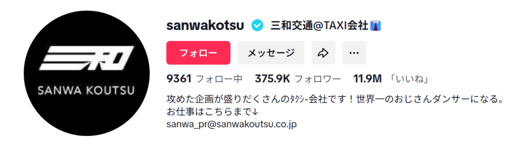 タクシー事業を中心に多角経営を展開する三和交通は、フォロワー数37万人という驚異的な数字を誇るTikTokアカウントで大きな成果を上げています。従業員による流行ダンス動画を中心としたコンテンツにより、親しみやすさと従業員同士の仲の良さを効果的にアピール。