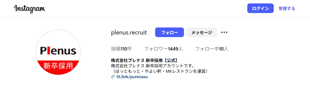 「やよい軒」や「ほっともっと」を運営するプレナスでは、フォロワー数1,449人のInstagramアカウントで新卒採用に特化した情報発信を行っています。社宅制度や育児休暇制度の紹介に加え、現役社員の趣向も紹介することで、求職者が「自分がプレナスに合っているかどうか」を判断しやすくなるコンテンツを提供しています。